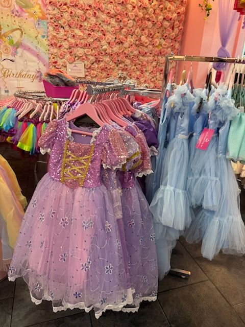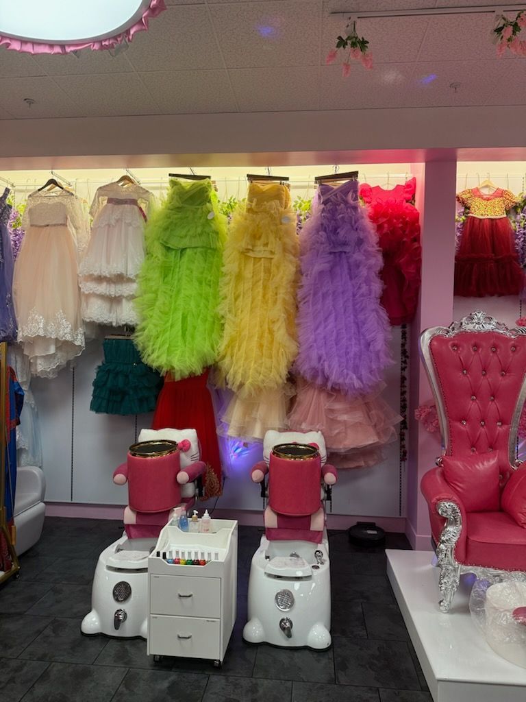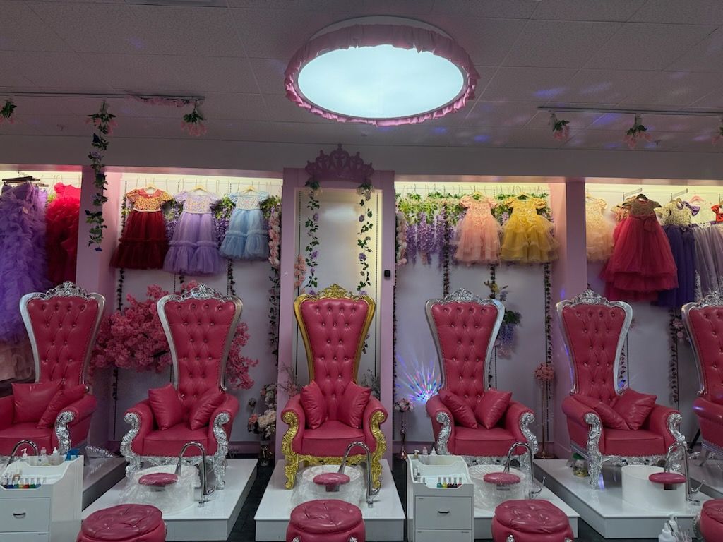 • The entrance to the princess party spa is decorated with balloons and a crown.